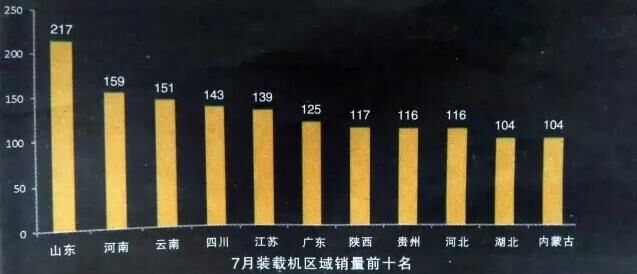 今年前7月,除2月份出口量不足800臺,其它月份出口數(shù)量基本均在1000~1300臺的區(qū)間內(nèi)上下波動,相對比較平穩(wěn)。分區(qū)域來看,山東省繼續(xù)保持領(lǐng)先,7月份銷量達到217臺,其余省份銷量均未達到200臺,天津、上海、青海、海南、西藏等仍是銷量最少的省、市、自治區(qū)。
