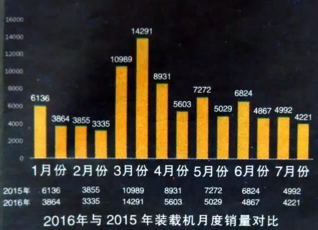 據(jù)公布的數(shù)據(jù),7月份全國26家主要裝載機生產(chǎn)企業(yè)共銷售各類裝載機4221臺,同比2015年7月份的4992臺,下降15.44%;環(huán)比6月份的4867臺,下降13.27%。其中3噸及以上裝載機銷量為3796臺,3噸以下小型裝載機銷量為425臺。從細分類型來看,3噸及5噸裝載機為主力銷售機型,合計銷量占比達到80%。綜合來看前7月銷量,除3月份曇花一現(xiàn)般同比大幅增長30.05%外,其余月份裝載機銷量均在下滑。但一個積極的現(xiàn)象是,4月份以來裝載機雖持續(xù)下滑,但降幅一直在收窄,自4月份的37.26%收窄到7月份的15.44%。