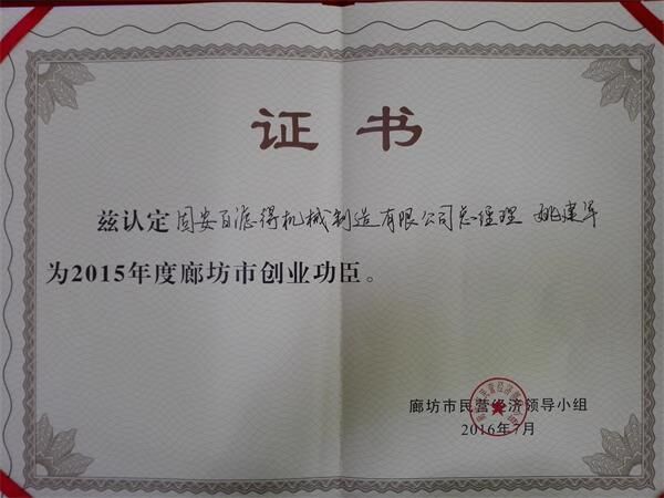 近日,固安百濾得機械制造有限公司總經(jīng)理姚建軍榮獲廊坊市創(chuàng)業(yè)功臣獎,獎金十萬元整,也正是如此,更加說明市場對百濾得的認可,百濾得對市場的優(yōu)質(zhì)服務(wù)。