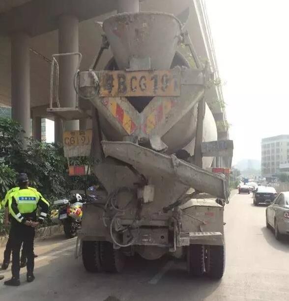 2016年9月26日8時45分許,深圳龍崗鐵騎六組在龍崗大道橫坪路口查處一輛號牌為粵BCG191的攪拌車,司機存在多個交通違法行為:放大號牌不清晰、未粘貼反光標志、輪胎嚴重磨損,極其危險!屬機件不全!