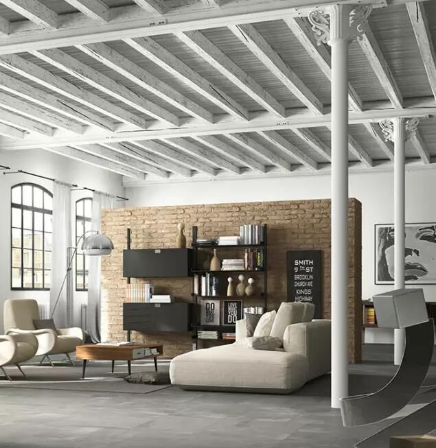 水泥灰的瓷磚,白色吊頂及墻面,營造出一種略微冰涼不近人情的工業(yè)氛圍,空闊粗糙的設(shè)計感,組成一個有著極大吸引力的家居風(fēng)格。
