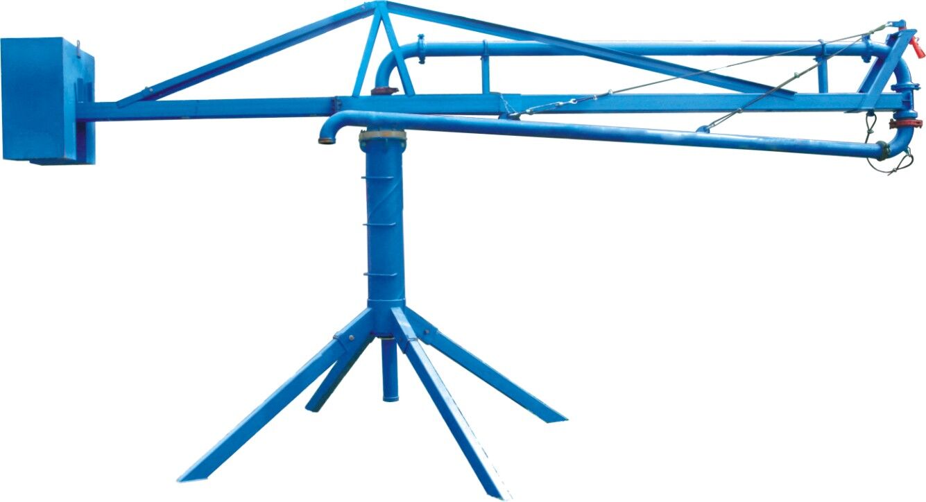 結構:、插銷、立架、構成的底座是固定部分,其上通過回轉支承與上部回轉部分相連,上主梁架、平衡臂、平衡臂架拉桿、上橫桿組成后回轉部分。立管上有回轉卡篐接頭。通過人力拉動,可使整個回轉部分回轉360度。上梁主架前端連接有一個回轉支座與前橫桿、前拉桿組成前回轉部分,在人力拉動下可繞回轉支座旋轉300度。由兩部分回轉架組成的合成運動就能覆蓋所有布料半徑范圍的布料點。