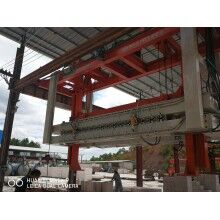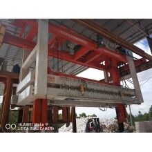 移動(dòng)式掰板機(jī)工作流程:蒸養(yǎng)完成的成品連同模具側(cè)板被模具側(cè)板運(yùn)輸裝置送至移動(dòng)掰板機(jī)下,頂升裝置啟動(dòng),將坯體連同側(cè)板頂起,移動(dòng)掰板機(jī)從上層至下層依次掰開(kāi),掰至底層后,移動(dòng)掰板機(jī)將全部成品夾起,并移至砌塊成品打包線上,將砌塊放置在該打包線上,移動(dòng)掰板機(jī)繼續(xù)將加氣板移動(dòng)至加氣板輸送打包線上,重新返回。掰扳機(jī)專(zhuān)門(mén)負(fù)責(zé)坯體切開(kāi)之后(經(jīng)蒸養(yǎng))又重新粘連在一起,在自動(dòng)打包之前將其一塊一塊分離,消除由于粘連造成的廢、次品,同時(shí)保證打包線正常運(yùn)行。