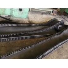 大傾角擋邊輸送帶的基帶是由上覆蓋膠、下覆蓋膠、帶芯和橫向剛性層四部分組成。上覆蓋膠厚度一般為3-6mm;下覆蓋膠厚度一般為1.5-4.5mm,帶芯材料承受拉力,其材料可以是棉帆布(CC)、尼龍帆布(NN)、聚酯帆布(EP)或鋼繩芯(ST)。為了增加基帶的橫行剛性,在芯體上下添加特殊加強(qiáng)層,稱橫向剛性層?;鶐У膶挾纫?guī)格,與普通膠帶相同,符合GB7984-2001的標(biāo)準(zhǔn)規(guī)定。
