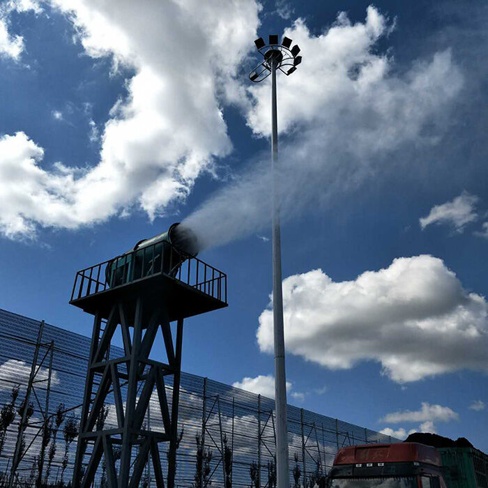 霧炮機降塵系統(tǒng)是用噴嘴將水霧化好之后,噴灑在灰塵較多的起源地,干燥的灰塵在空中慢慢加濕,而且水霧細小在空氣中懸浮時間會長一些,能有效的控制粉塵的發(fā)生。