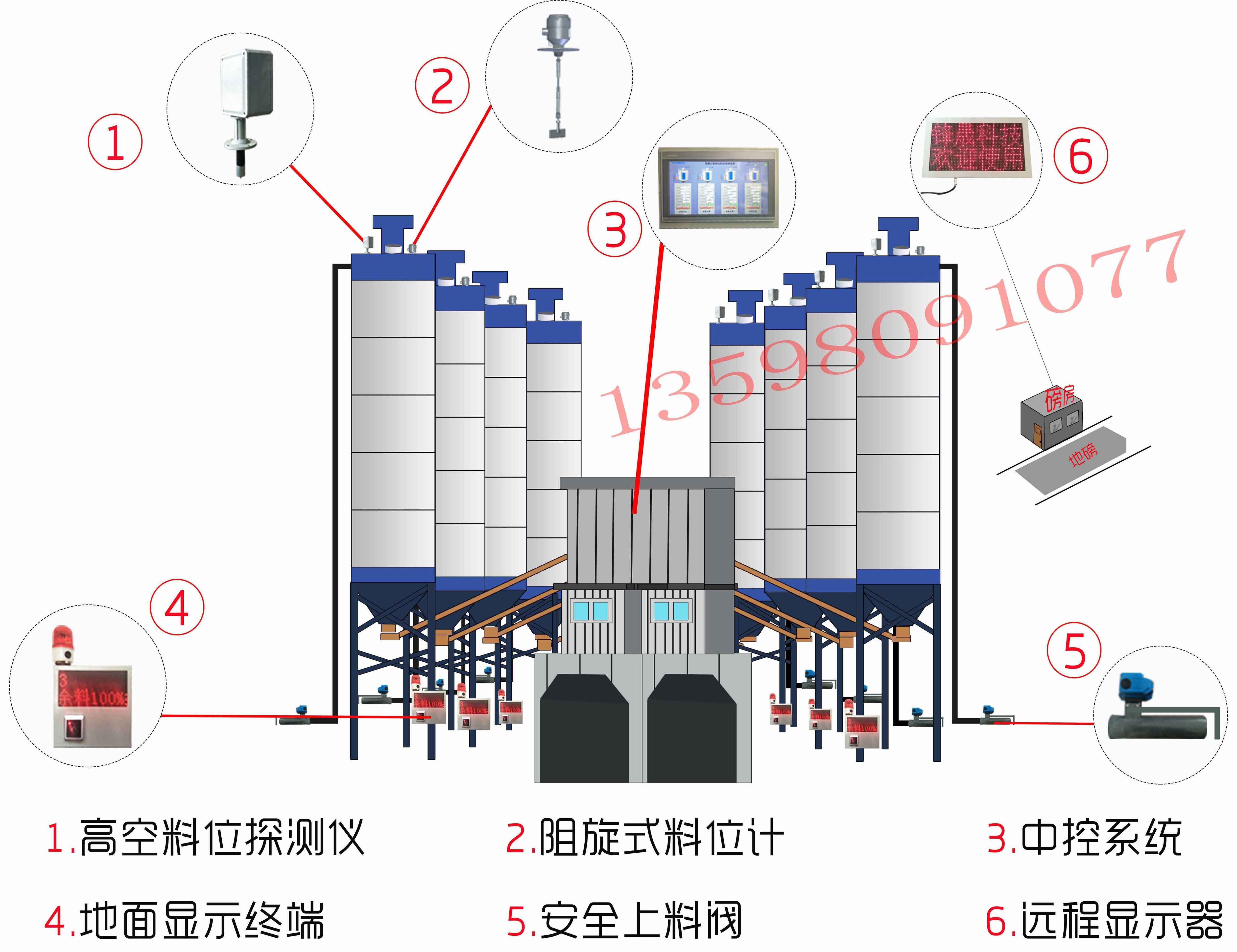 攪拌站料倉安全系統(tǒng)主要由高空料位探測儀、阻旋式料位計、中控系統(tǒng)、地面顯示終端、安全上料閥以及遠端顯示器組成。該料位測量系統(tǒng)具有安裝簡單、維護方便、測量精準、使用安全性高、安裝過程中不需要停產(chǎn)等優(yōu)勢,是防止水泥罐冒倉的實時測量水泥倉物料面的料位測量系統(tǒng)。