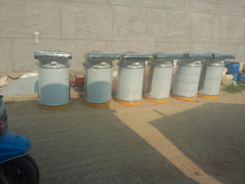 單機 屬于機械抖動除塵器,其基本結(jié)構(gòu)由風(fēng)機、過濾器和集塵器三個部分組成,各部件都安裝在一個立式框架內(nèi),鋼板殼體,烘漆防銹,運行可靠,使用方便。風(fēng)機采用離心風(fēng)機,風(fēng)量大,風(fēng)壓高,并采用消聲措施,噪音小。過濾器采用扁布袋組,每個布袋內(nèi)裝有彈簧鋼絲網(wǎng),過濾效果好。清灰機構(gòu)采用電動機帶動偏心輪、連桿使布袋抖動而   沾在濾袋表面的粉塵。此除塵器設(shè)有檢修門,方便檢修和換袋。