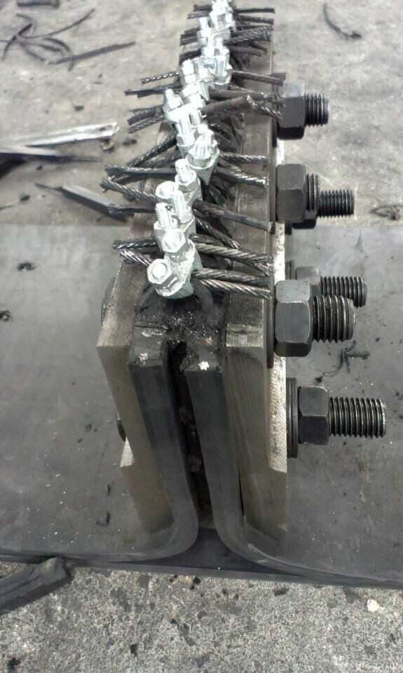 2).夾緊后,剝除提升帶兩端覆蓋膠,剝出鋼絲繩芯。