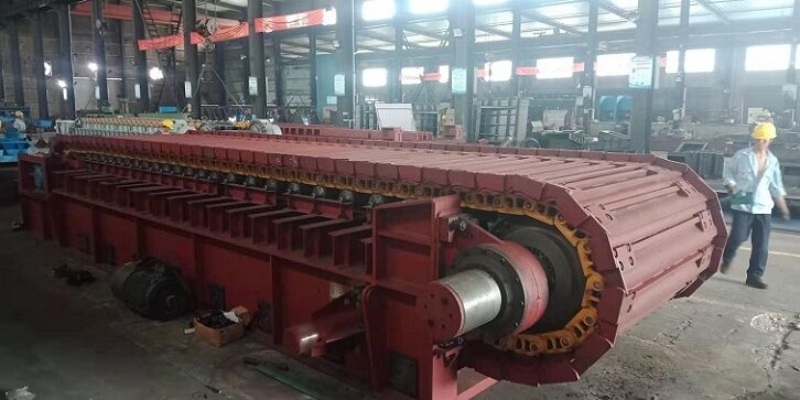 5、頭尾輪應(yīng)采用優(yōu)質(zhì)鑄鋼件并經(jīng)良好的熱處理,應(yīng)帶有張緊裝置。喂料倉與板喂機之間應(yīng)設(shè)有溜槽,板喂機帶支架和支腿。