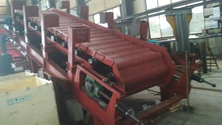 采用變頻電機和減速機組合,具有調速功能,傳動平穩(wěn)、可靠,調速方便,用戶可根據(jù)來料量大小調節(jié)轉速。 可根據(jù)用戶要求配變頻調速裝置,增減電機轉速,調節(jié)輸送量。 輸出軸鏈輪與頭輪組采用 32A 套筒滾子鏈連接, 便于更換, 使用壽命長。