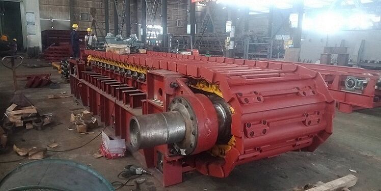 鏈板組件直接承受礦倉物料壓力和運送物料。鏈板組件由輸送板、牽引鏈軌及其聯(lián)接螺栓組成。輸送板采用搭接式結構。輸送板材質(zhì)為高錳鋼,鑄造成型,相互搭接,輸送板用螺栓固定在鏈軌上。這種板不僅重量輕、不漏礦,而且強度高、耐磨損、抗沖擊。