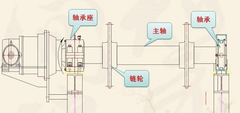 該裝置主要由軸、鏈輪、支承輥等件組成。兩端支撐為滾動(dòng)軸承,主軸與減速器、空心軸套裝在一起,通過(guò)鎖緊盤將其二者連接到一起,達(dá)到傳遞扭矩的要求,結(jié)構(gòu)緊湊。