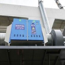 惡臭氣體利用排風設備輸入到UV光解凈化設備后,凈化設備利用特制的高能高臭氧UV紫外線光束照射惡臭氣體和TiO2光催化,催化裂解惡臭氣體,進行協同分解氧化反應,使惡臭氣體物質其降解化成低分子化合物、水和二氧化碳,再通過排風管道排出室外。