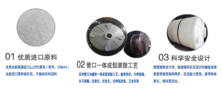 特點:所用材質(zhì)為韓國進口聚乙烯(PE)滾塑原料,儲罐一次成型,內(nèi)外光滑,無焊接縫、不滲漏、具有良好的衛(wèi)生性與抗紫外線能力,耐酸堿、耐腐蝕、易清洗、不易老化、抗沖擊。它可以盛裝在常溫下無機酸、堿、鹽等大部分物質(zhì)及有機物,耐熱耐凍性佳,在-5℃—+60℃均可使用。