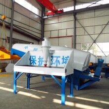落地式砂石分離機整套系統(tǒng)主要由:攪拌車加水清洗裝置,溜槽裝置,砂石漿水分離裝置,和泥漿水后處理裝置組成?;炷凛斔驮O備清洗后,將殘余混凝土排入溜槽中,在高壓水流沖擊下,經(jīng)溜槽進入砂石分離機,在不斷旋轉的分離機作用下,對混凝土進行充分的清洗,同時將砂石、漿水進行分離,分離后的砂、石在導料葉片的作用下背向流動至出料口排出分離機落入振動篩分機,通過篩分將沙、石子分開,分別堆放。清洗后的漿水從分離機的溢水口排出進入濃漿池,經(jīng)污水泵加壓打到旋流器除去多余固體微粒,降低漿水濃度,進入攪拌池回收利用。進入攪拌池的漿水為了防止沉淀凝固,需通過攪拌器的作用,攪拌器的工作為間歇式。分離出水泥漿在連續(xù)的攪拌器作用下,再通過高壓污水泵輸送到攪拌樓中待生產(chǎn)再利用。整個控制系統(tǒng)設有手動和自動控制,方便控制設置,整個系統(tǒng)運行可靠,故障率低,維護量少等特點。