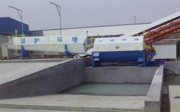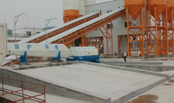 該系統(tǒng)主要由:攪拌車加水清洗裝置,溜槽輸送裝置,砂石漿水分離裝置,和泥漿水后處理裝置組成?;炷凛斔驮O備清洗后,將殘余混凝土排入溜槽中,在高壓水流沖擊下,經(jīng)溜槽進入砂石分離機,在不斷旋轉的分離機作用下,對混凝土進行充分的清洗,同時將砂、石進行分離,分離后的砂、石在導料葉片的作用下背向流動,再通過提升式出料口排出分離機,分別堆放。清洗后的漿水從分離機的底部排出進入沉淀池逐級沉淀后循環(huán)使用或進入攪拌池回收利用。進入攪拌池(一般情況2個攪拌池)的漿水為了防止沉淀凝固,需通過攪拌器的作用,攪拌器的工作為間歇式。分離出水泥漿在連續(xù)的攪拌器作用下,再通過高壓污水泵輸送到攪拌樓中待生產(chǎn)計量再利用。整個控制系統(tǒng)設有手動和自動控制,方便控制設置,整個系統(tǒng)運行可靠,故障率低,維護量少等特點。