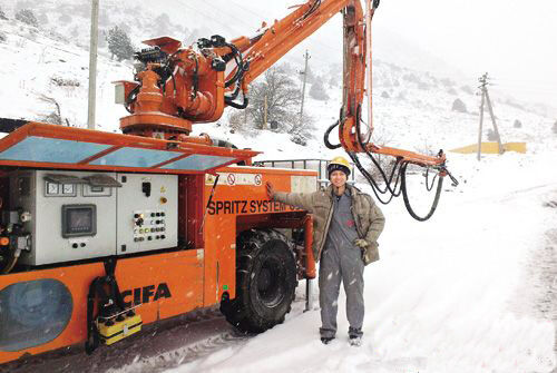 易穎志趕到工地后,發(fā)現(xiàn)設(shè)備油漆刮擦嚴(yán)重,許多部位變形,與客戶協(xié)調(diào)后,易穎志便開(kāi)始檢測(cè)和開(kāi)機(jī)調(diào)試。烏茲別克斯坦氣溫很低,夜間最低溫度達(dá)到了零下20多度,幾臺(tái)設(shè)備都在冰天雪地里,為保證設(shè)備盡快能使用,易穎志抵抗著極寒天氣在隧道外檢測(cè),做各種調(diào)試。由于設(shè)備發(fā)生過(guò)碰撞,機(jī)械變形問(wèn)題較多,易穎志擔(dān)心設(shè)備漏油,所以對(duì)每個(gè)有可能漏油的地方,他都會(huì)鉆到車底細(xì)心檢查,隨后再檢查設(shè)備的各項(xiàng)動(dòng)作和功能是否正常。他自己檢測(cè)一遍后,再教工地上的當(dāng)?shù)貦C(jī)手如何使用設(shè)備、保養(yǎng)設(shè)備,并開(kāi)機(jī)試料,及時(shí)給出配比意見(jiàn)。